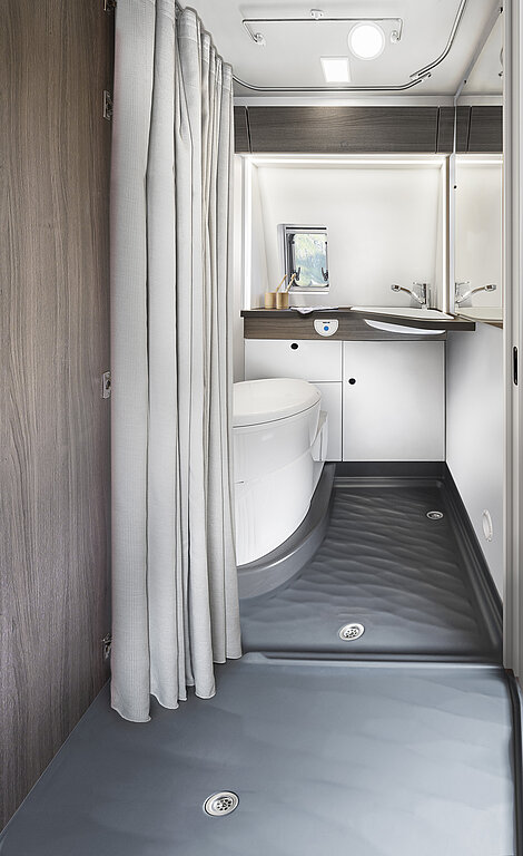 - Bagno: ampio bagno Vario con piatto doccia allargato e inserto, WC a cassetta Thetford, finestra del bagno con tenda oscurante, ventilatore a soffitto