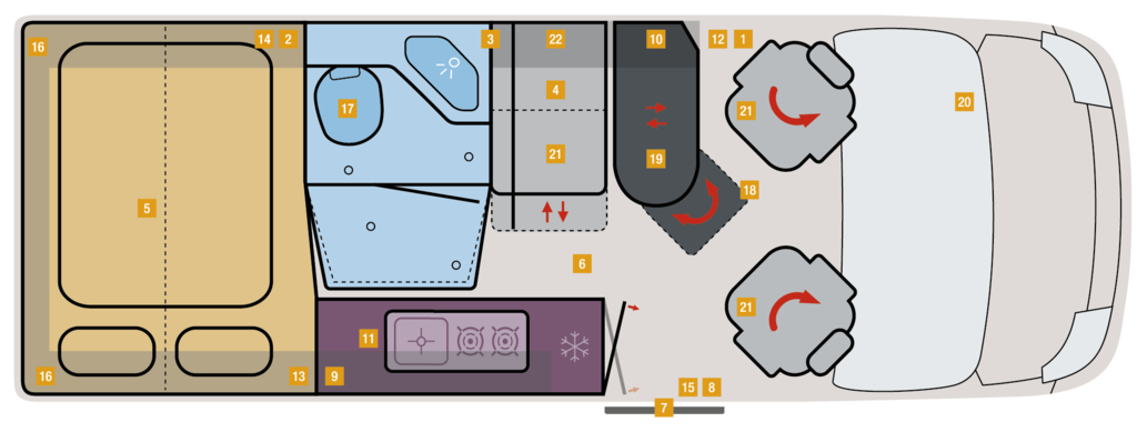 Di serie, il VANTourer 600 D è dotato di due posti letto fissi grazie al letto trasversale nella parte posteriore (letto matrimoniale). Grazie alle estensioni opzionali, la capacità letto può essere adattata in modo flessibile: