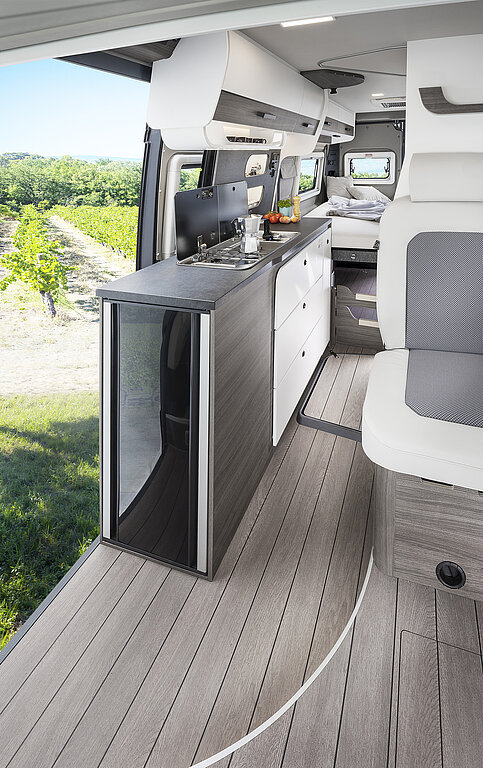 Con una lunghezza di 599 cm, una larghezza esterna di 205 cm e un'altezza di 258 cm, il VANTourer 600 D è il camper più versatile tra i camper van. Grazie alla sua disposizione interna ben studiata, combina una sensazione di spazio generoso con la praticità quotidiana. All'interno potrete godere di un'altezza di 190 cm e una larghezza interna di 187 cm, ideali per vivere, cucinare e dormire comodamente.