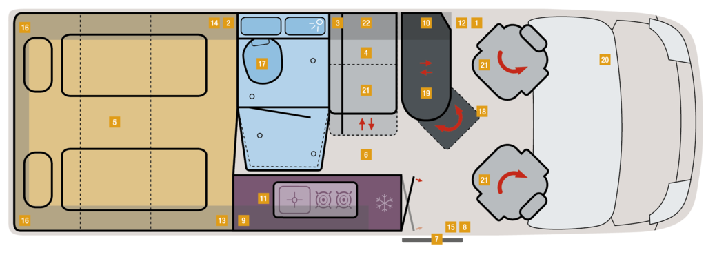 Di serie, il VANTourer 630 L dispone di due letti singoli fissi nella parte posteriore. Per aumentare la capacità di posti letto sono disponibili le seguenti opzioni aggiuntive: