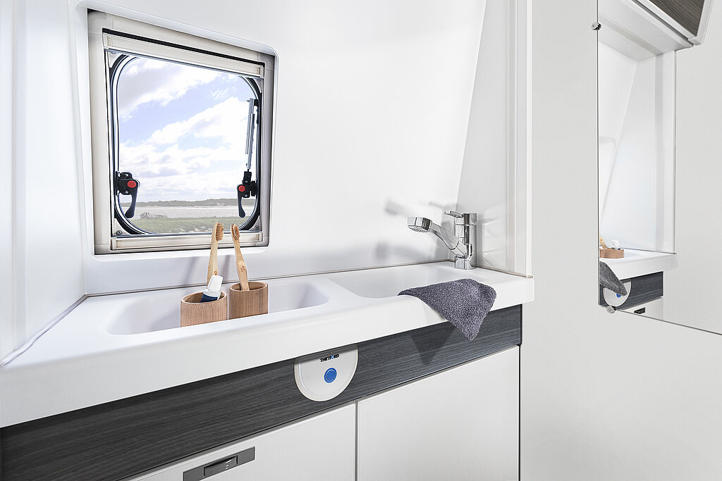 Więcej światła. Więcej przestrzeni. Opcjonalna zabudowa przedniej części z dużym oknem panoramicznym zapewnia maksymalny dopływ światła dziennego do pomieszczenia mieszkalnego i tworzy jasną, przyjazną atmosferę. Aby zapewnić przyjemny klimat w pomieszczeniu, okno można otworzyć na zewnątrz. Bezpośrednio przed nim znajduje się składana półka, na której można położyć kurtki lub inne lekkie ubrania. Dodatkowa przestrzeń do przechowywania z boku półki zapewnia jeszcze większy porządek i komfort.